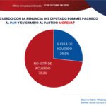 Esto fue reflejado por la firma consultora Massive Caller, quien confirma que de un universo del 100 por ciento de entrevistados el 73.2% de ellos, es decir, 7 de cada 10 no estuvo de acuerdo con el cambio de partido del ex clavadista del PAN a Morena, y solo el 26.8% de ellos dijo estar de acuerdo con este cambio de Pacheco Marrufo.