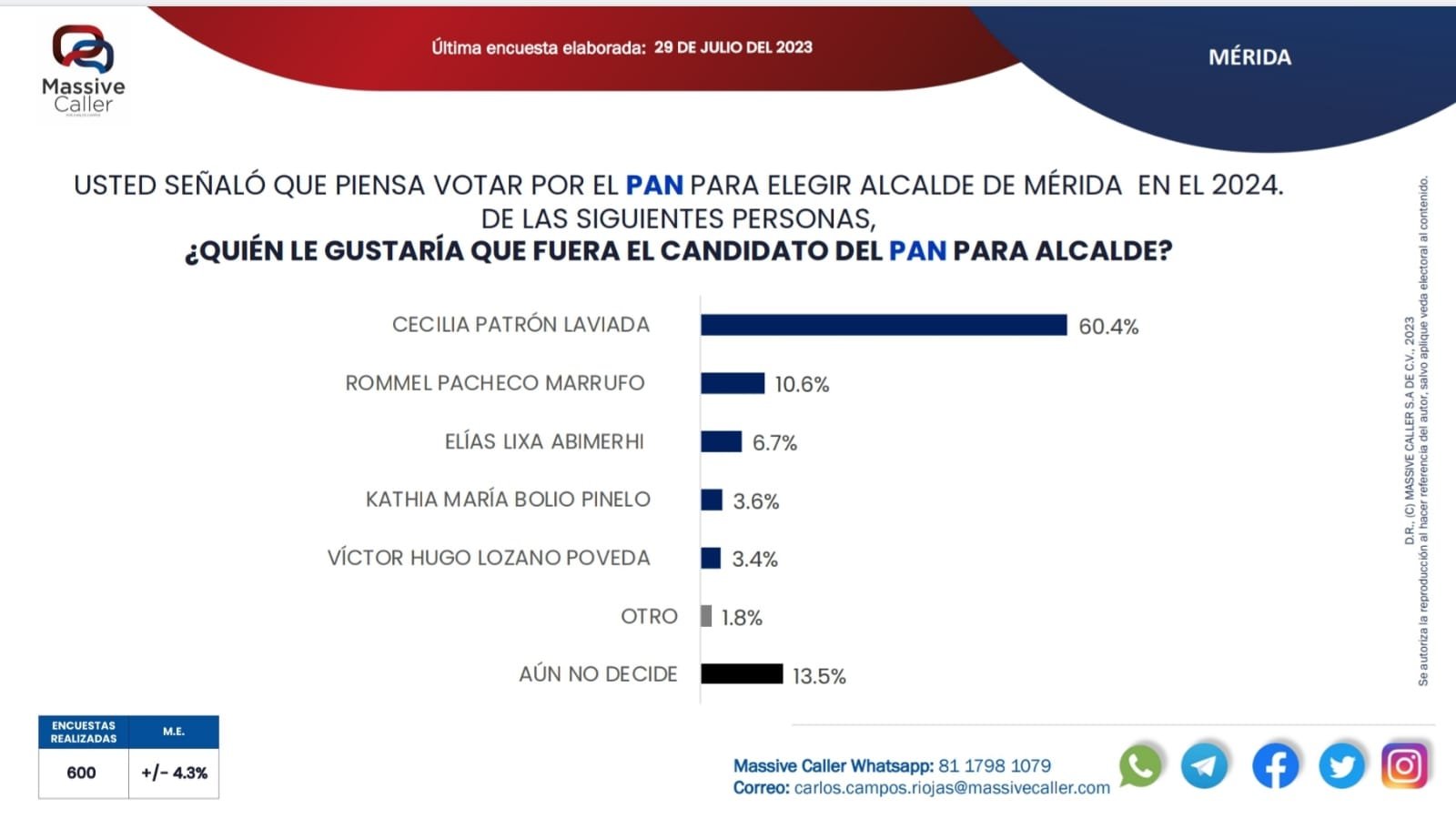En cuanto a los posibles candidatos, en el PAN destaca que quienes votarían por este partido prefieren a la actual diputada federal Cecilia Patrón con un 60.4 por ciento, luego Rommel Pacheco Marrufo con 10.6, Elías Lixa Abimerhi con 6.7, Katia Bolio Pinelo con 3.6 y Víctor Hugo Lozano Poveda con 3.4.