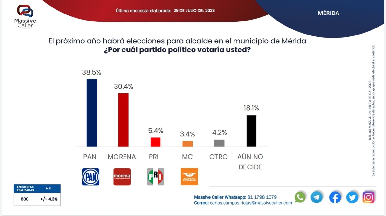 Del estudio se desprende que el Partido Acción Nacional ganaría las elecciones para presidente municipal de Mérida con un 38.5 por ciento, más de ocho puntos porcentuales por encima del siguiente contrincante que es Morena.